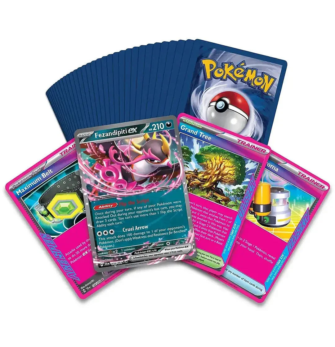incluyendo 5 cartas promo y 3 cartas de AS TÁCTICO, además de 1 copia de Fezandipiti ex